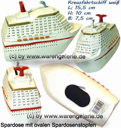 Spardose Kreuzfahrtschiff weiß 15,5 cm Urlaubsspardose aus Polyresin- Kunstharz (Kunststein) mit einem ovalen Spardosenstopfen aus Kunststoff