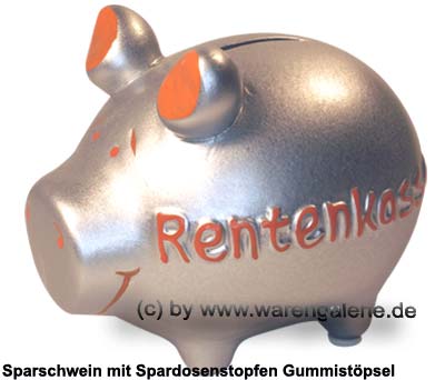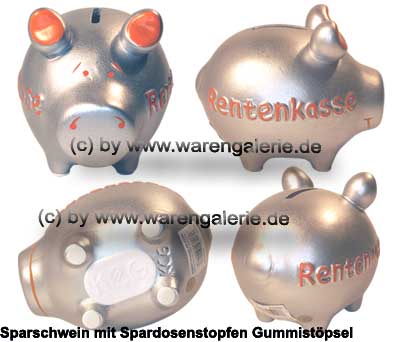 Ein hochwertiges Kleinsparschwein mit einer beidseitigen Rentenkasse3D Beschriftung in orangener Farbe, Design in silberfarben/ bunter Farbe unter glänzender Keramik- Glasur. Das Sparschwein aus Keramik und der ovale Spardosenstopfen/ Spardosenstöpsel aus Gummi, wurden in sehr guter Qualität hergestellt.