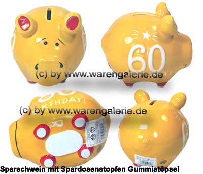 Ein hochwertiges Kleinsparschwein mit einer beidseitigen 60 Birthday!3D Beschriftung in weißer Farbe, Design in gelb/ bunter Farbe unter glänzender Keramik- Glasur. Das Sparschwein aus Keramik und der ovale Spardosenstopfen/ Spardosenstöpsel aus Gummi, wurden in sehr guter Qualität hergestellt.