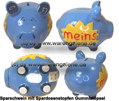 Ein hochwertiges mittelgroßes Sparschwein mit einer beidseitigen Meins! 3D Beschriftung in roter Farbe, Design in hellblau/ bunter Farbe unter glänzender Keramik-Glasur, ebenfalls unter der Glasur im 3D Design in der Keramik eingearbeitet, ein großer gelber Stern. Das Sparschwein aus Keramik und der ovale Spardosenstopfen/ Spardosenstöpsel aus Gummi, wurden in sehr guter Qualität hergestellt.